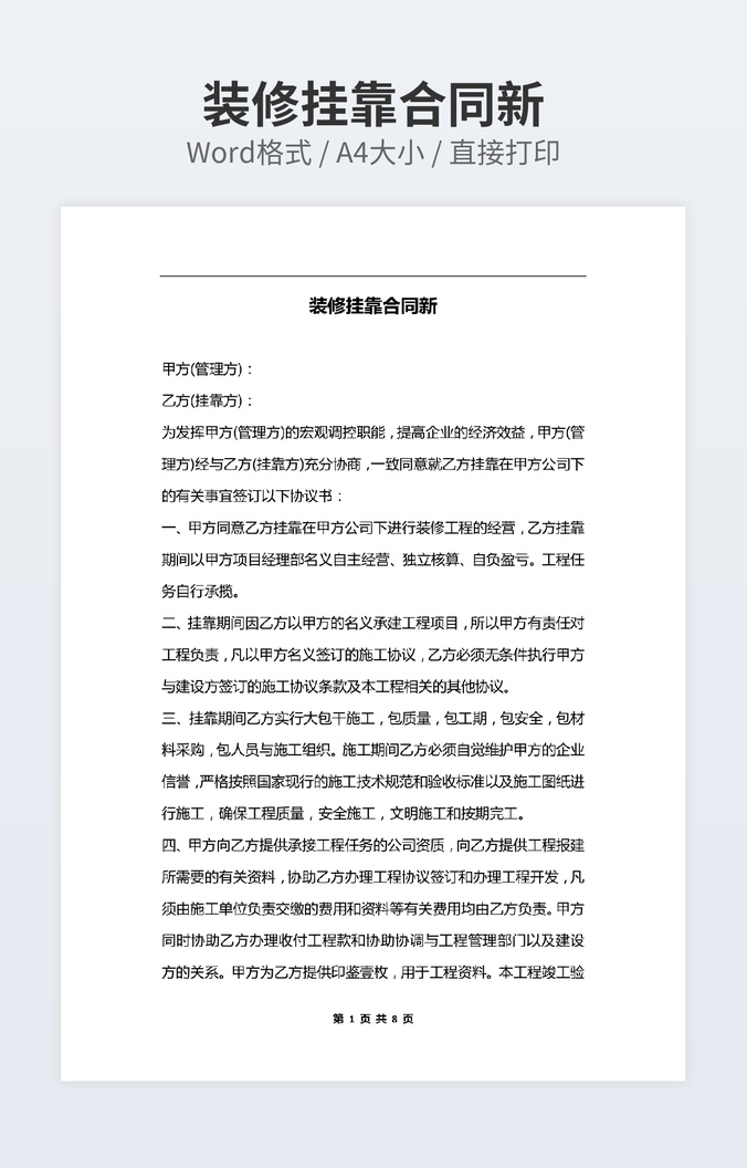 【特殊限制】设计师仅对作品中独创性部分享有著作权,对作品中含有的国旗、国徽等政治图案不享有权利,仅作为作品整体效果的示例展示,禁止商用。 相关关键词: 精装 装修 协议 模板
