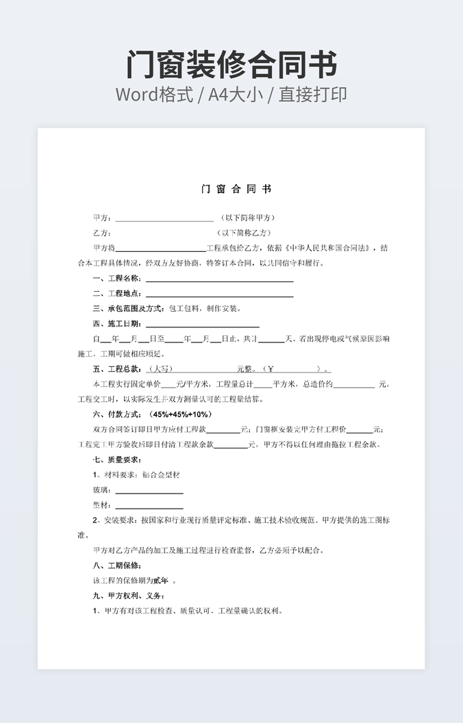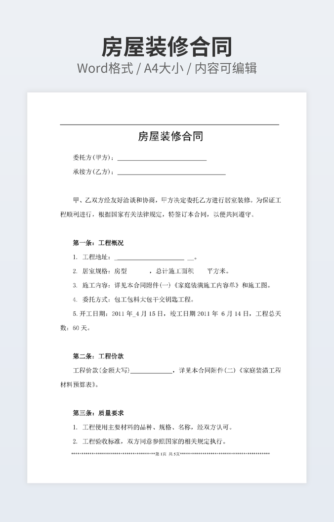 本作品内容为精装装修协议模板下载,大小为15.91KB,作品为高清大图模板,格式为docx, 属于房屋装修模板,作品模板源文件下载后可用编辑替换,模板中如有人物画像仅供参考禁止商用。小Q办公网-提供简历,PPT,Word,Excel优质模板素材下载模版平台,拥有海量的工作总结、竞聘求职、年终颁奖、计划书等。 通过小Q办公网下载房屋装修模板源文件编辑修改源文件文字和图片即可使用。