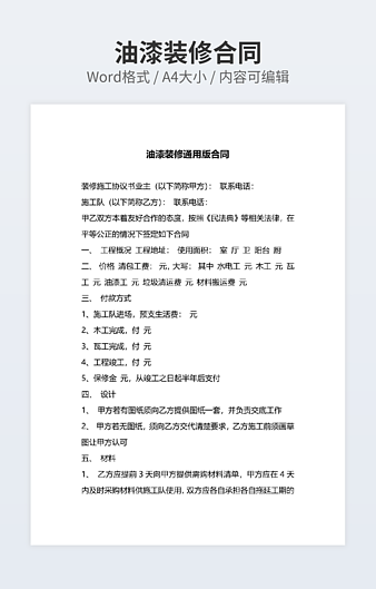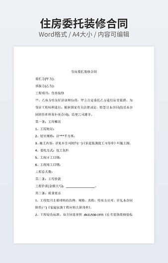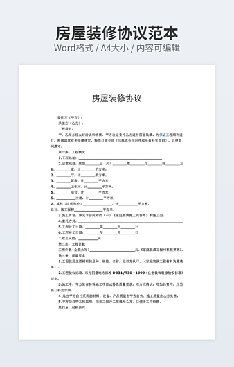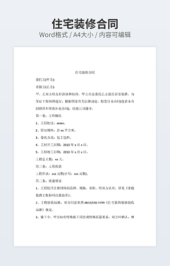 本作品内容为酒店宾馆装修合同下载,大小为19.4KB,作品为高清大图模板,格式为docx, 属于房屋装修模板,作品模板源文件下载后可用编辑替换,模板中如有人物画像仅供参考禁止商用。小Q办公网-提供简历,PPT,Word,Excel优质模板素材下载模版平台,拥有海量的工作总结、竞聘求职、年终颁奖、计划书等。 通过小Q办公网下载房屋装修模板源文件编辑修改源文件文字和图片即可使用。