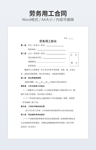 本作品内容为个人劳务合同书范本下载下载,大小为17.02KB,作品为高清大图模板,格式为docx, 属于劳务合同模板,作品模板源文件下载后可用编辑替换,模板中如有人物画像仅供参考禁止商用。小Q办公网-提供简历,PPT,Word,Excel优质模板素材下载模版平台,拥有海量的工作总结、竞聘求职、年终颁奖、计划书等。 通过小Q办公网下载劳务合同模板源文件编辑修改源文件文字和图片即可使用。