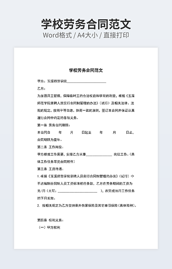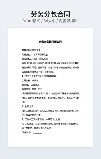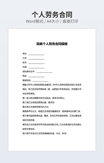 【特殊限制】设计师仅对作品中独创性部分享有著作权,对作品中含有的国旗、国徽等政治图案不享有权利,仅作为作品整体效果的示例展示,禁止商用。 相关关键词: 个人 劳务 劳务合同 合同书 范本 下载