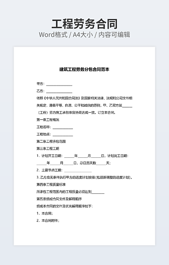 本作品内容为劳务用工合同下载,大小为20.5KB,作品为高清大图模板,格式为doc, 属于劳务合同模板,作品模板源文件下载后可用编辑替换,模板中如有人物画像仅供参考禁止商用。小Q办公网-提供简历,PPT,Word,Excel优质模板素材下载模版平台,拥有海量的工作总结、竞聘求职、年终颁奖、计划书等。 通过小Q办公网下载劳务合同模板源文件编辑修改源文件文字和图片即可使用。