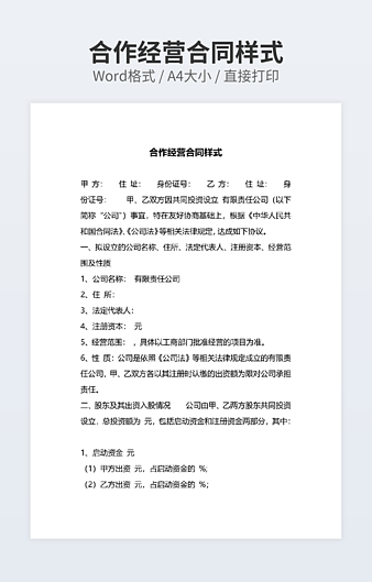 【特殊限制】设计师仅对作品中独创性部分享有著作权,对作品中含有的国旗、国徽等政治图案不享有权利,仅作为作品整体效果的示例展示,禁止商用。 相关关键词: 合作经营 合同 范文