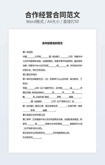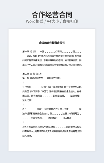 本作品内容为合法的合作经营合同下载,大小为15.13KB,作品为高清大图模板,格式为docx, 属于经营合作模板,作品模板源文件下载后可用编辑替换,模板中如有人物画像仅供参考禁止商用。小Q办公网-提供简历,PPT,Word,Excel优质模板素材下载模版平台,拥有海量的工作总结、竞聘求职、年终颁奖、计划书等。 通过小Q办公网下载经营合作模板源文件编辑修改源文件文字和图片即可使用。