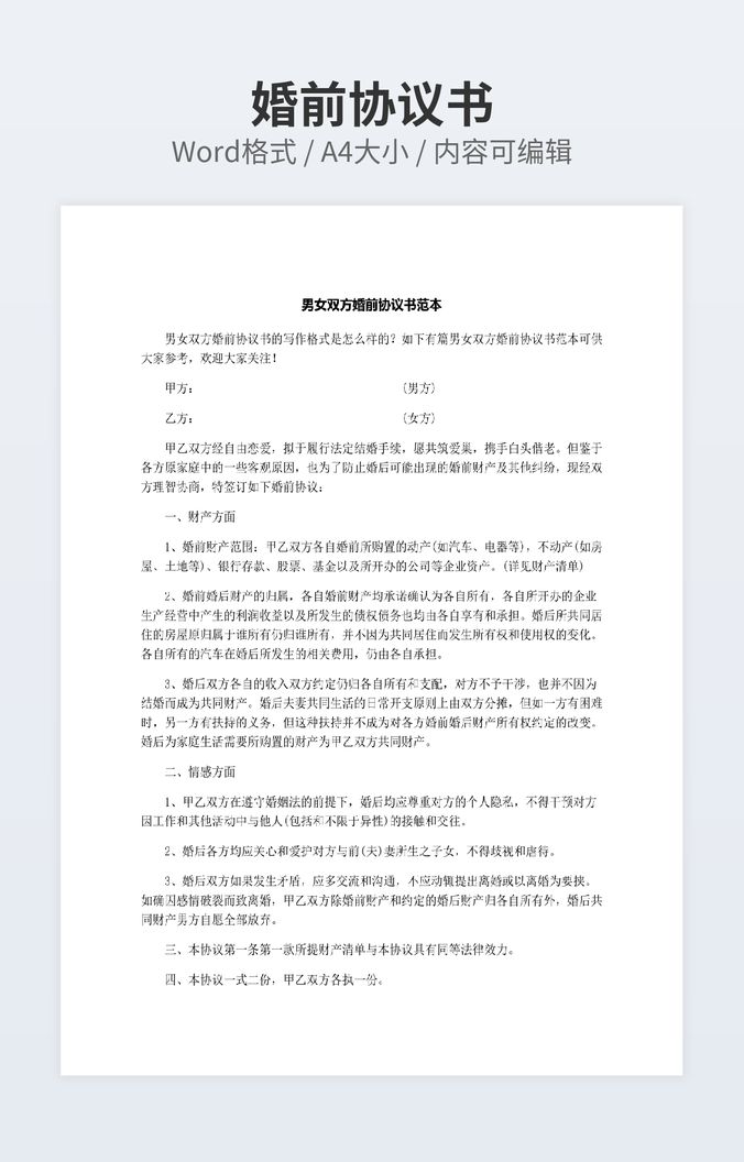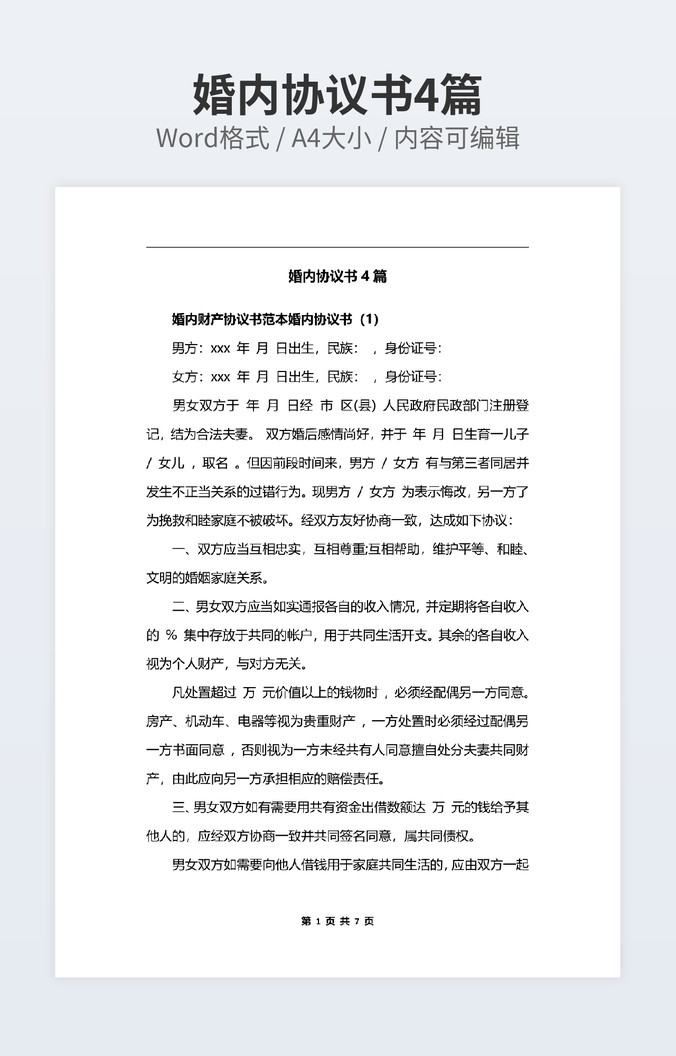 本作品内容为婚内财产约定协议下载,大小为15.86KB,作品为高清大图模板,格式为docx, 属于婚内协议模板,作品模板源文件下载后可用编辑替换,模板中如有人物画像仅供参考禁止商用。小Q办公网-提供简历,PPT,Word,Excel优质模板素材下载模版平台,拥有海量的工作总结、竞聘求职、年终颁奖、计划书等。 通过小Q办公网下载婚内协议模板源文件编辑修改源文件文字和图片即可使用。