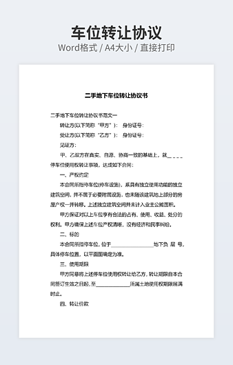 本作品内容为地下停车位出租租赁合同下载,大小为15.23KB,作品为高清大图模板,格式为docx, 属于车位租赁模板,作品模板源文件下载后可用编辑替换,模板中如有人物画像仅供参考禁止商用。小Q办公网-提供简历,PPT,Word,Excel优质模板素材下载模版平台,拥有海量的工作总结、竞聘求职、年终颁奖、计划书等。 通过小Q办公网下载车位租赁模板源文件编辑修改源文件文字和图片即可使用。