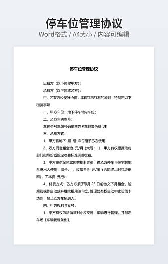 本作品内容为私人地下车位出租协议下载,大小为17KB,作品为高清大图模板,格式为doc, 属于车位租赁模板,作品模板源文件下载后可用编辑替换,模板中如有人物画像仅供参考禁止商用。小Q办公网-提供简历,PPT,Word,Excel优质模板素材下载模版平台,拥有海量的工作总结、竞聘求职、年终颁奖、计划书等。 通过小Q办公网下载车位租赁模板源文件编辑修改源文件文字和图片即可使用。