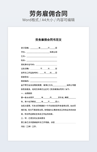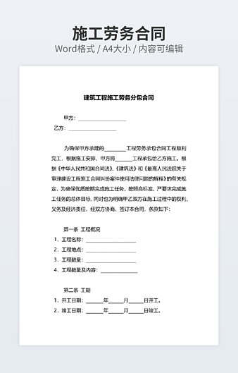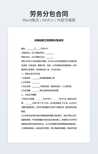 本作品内容为劳务分包合同常用样书下载,大小为15.9KB,作品为高清大图模板,格式为docx, 属于劳务合同模板,作品模板源文件下载后可用编辑替换,模板中如有人物画像仅供参考禁止商用。小Q办公网-提供简历,PPT,Word,Excel优质模板素材下载模版平台,拥有海量的工作总结、竞聘求职、年终颁奖、计划书等。 通过小Q办公网下载劳务合同模板源文件编辑修改源文件文字和图片即可使用。