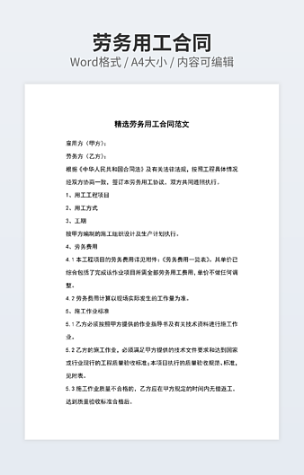 本作品内容为劳务外包合同范文下载,大小为14.65KB,作品为高清大图模板,格式为docx, 属于劳务合同模板,作品模板源文件下载后可用编辑替换,模板中如有人物画像仅供参考禁止商用。小Q办公网-提供简历,PPT,Word,Excel优质模板素材下载模版平台,拥有海量的工作总结、竞聘求职、年终颁奖、计划书等。 通过小Q办公网下载劳务合同模板源文件编辑修改源文件文字和图片即可使用。