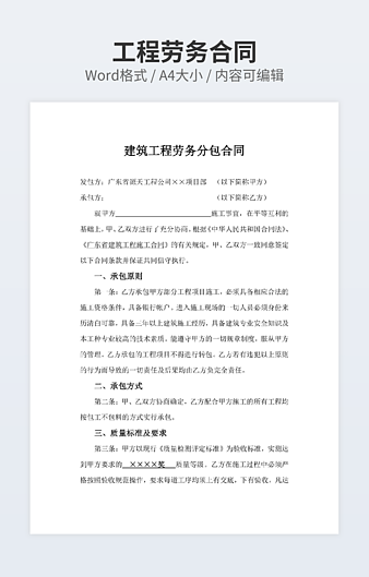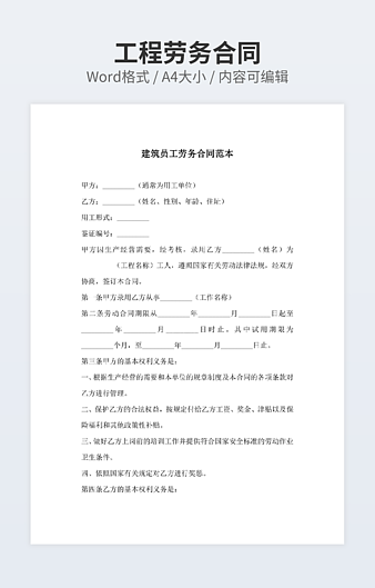 本作品内容为劳务施工合同范本下载,大小为19.81KB,作品为高清大图模板,格式为docx, 属于劳务合同模板,作品模板源文件下载后可用编辑替换,模板中如有人物画像仅供参考禁止商用。小Q办公网-提供简历,PPT,Word,Excel优质模板素材下载模版平台,拥有海量的工作总结、竞聘求职、年终颁奖、计划书等。 通过小Q办公网下载劳务合同模板源文件编辑修改源文件文字和图片即可使用。