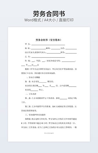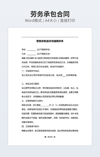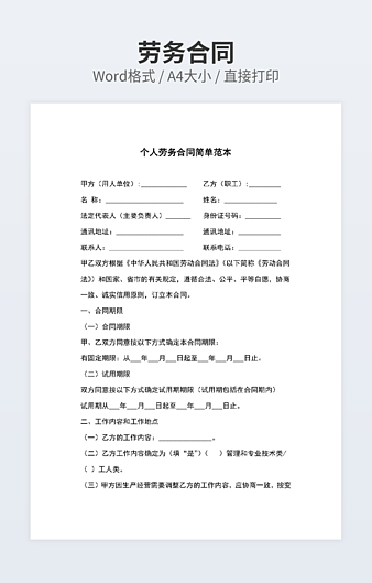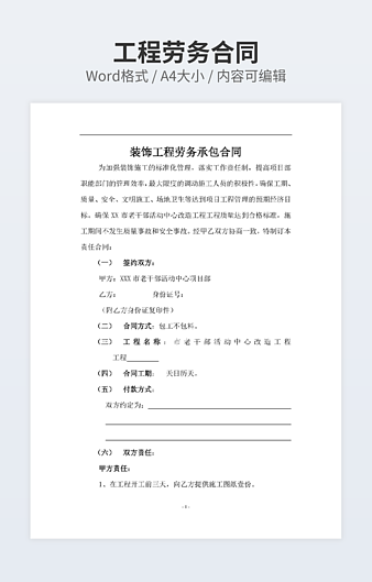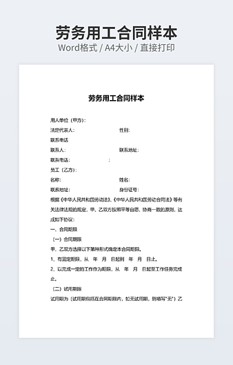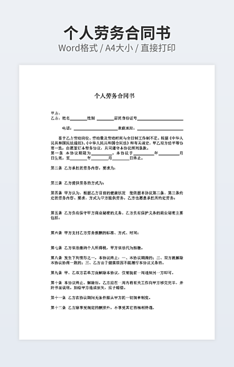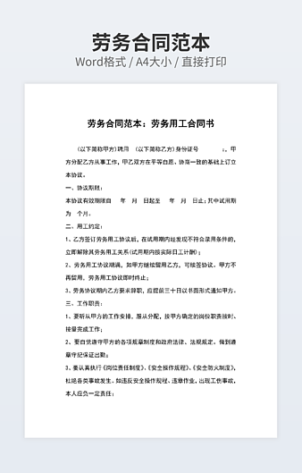 本作品内容为劳务雇佣合同书范文下载,大小为16.2KB,作品为高清大图模板,格式为docx, 属于劳务合同模板,作品模板源文件下载后可用编辑替换,模板中如有人物画像仅供参考禁止商用。小Q办公网-提供简历,PPT,Word,Excel优质模板素材下载模版平台,拥有海量的工作总结、竞聘求职、年终颁奖、计划书等。 通过小Q办公网下载劳务合同模板源文件编辑修改源文件文字和图片即可使用。