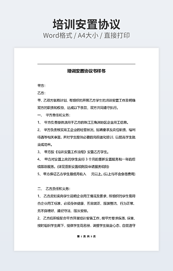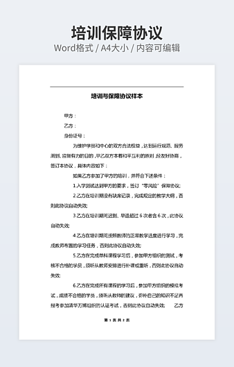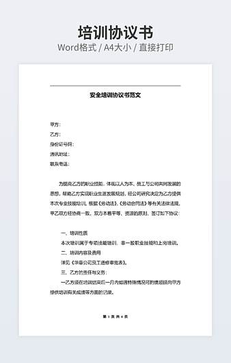 本作品内容为专项培训协议书范本下载,大小为17.37KB,作品为高清大图模板,格式为docx, 属于培训协议模板,作品模板源文件下载后可用编辑替换,模板中如有人物画像仅供参考禁止商用。小Q办公网-提供简历,PPT,Word,Excel优质模板素材下载模版平台,拥有海量的工作总结、竞聘求职、年终颁奖、计划书等。 通过小Q办公网下载培训协议模板源文件编辑修改源文件文字和图片即可使用。