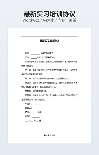【特殊限制】设计师仅对作品中独创性部分享有著作权,对作品中含有的国旗、国徽等政治图案不享有权利,仅作为作品整体效果的示例展示,禁止商用。 相关关键词: 公司 培训 协议书 格式