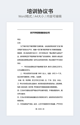本作品内容为员工培训协议范本样式一下载,大小为17.22KB,作品为高清大图模板,格式为docx, 属于培训协议模板,作品模板源文件下载后可用编辑替换,模板中如有人物画像仅供参考禁止商用。小Q办公网-提供简历,PPT,Word,Excel优质模板素材下载模版平台,拥有海量的工作总结、竞聘求职、年终颁奖、计划书等。 通过小Q办公网下载培训协议模板源文件编辑修改源文件文字和图片即可使用。