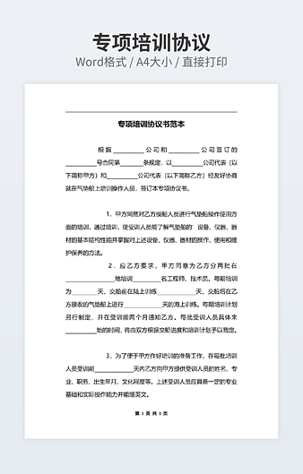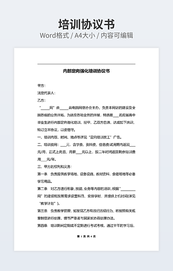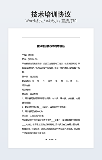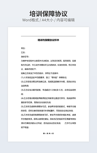 本作品内容为岗前培训协议范本最新整理版下载,大小为17.76KB,作品为高清大图模板,格式为docx, 属于培训协议模板,作品模板源文件下载后可用编辑替换,模板中如有人物画像仅供参考禁止商用。小Q办公网-提供简历,PPT,Word,Excel优质模板素材下载模版平台,拥有海量的工作总结、竞聘求职、年终颁奖、计划书等。 通过小Q办公网下载培训协议模板源文件编辑修改源文件文字和图片即可使用。