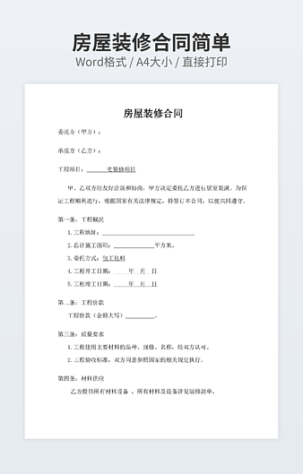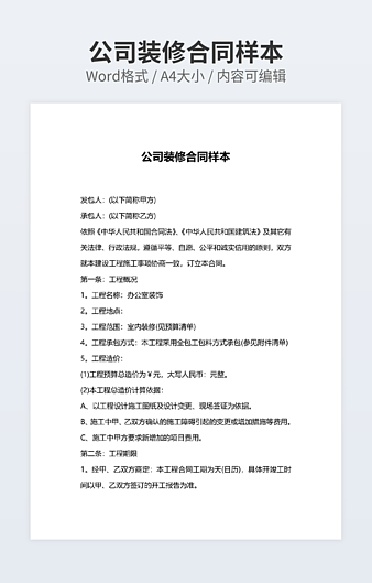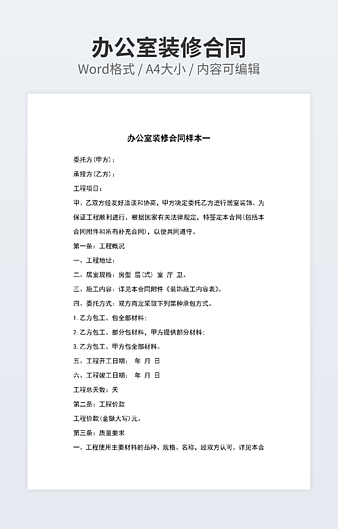 本作品内容为商场装修的合同范本下载,大小为18.51KB,作品为高清大图模板,格式为docx, 属于房屋装修模板,作品模板源文件下载后可用编辑替换,模板中如有人物画像仅供参考禁止商用。小Q办公网-提供简历,PPT,Word,Excel优质模板素材下载模版平台,拥有海量的工作总结、竞聘求职、年终颁奖、计划书等。 通过小Q办公网下载房屋装修模板源文件编辑修改源文件文字和图片即可使用。