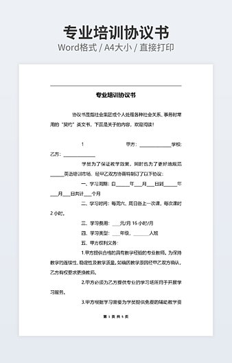 本作品内容为培训协议书格式范本下载,大小为17.45KB,作品为高清大图模板,格式为docx, 属于培训协议模板,作品模板源文件下载后可用编辑替换,模板中如有人物画像仅供参考禁止商用。小Q办公网-提供简历,PPT,Word,Excel优质模板素材下载模版平台,拥有海量的工作总结、竞聘求职、年终颁奖、计划书等。 通过小Q办公网下载培训协议模板源文件编辑修改源文件文字和图片即可使用。