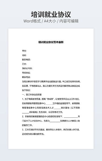 本作品内容为电脑培训协议书范本下载,大小为18.14KB,作品为高清大图模板,格式为docx, 属于培训协议模板,作品模板源文件下载后可用编辑替换,模板中如有人物画像仅供参考禁止商用。小Q办公网-提供简历,PPT,Word,Excel优质模板素材下载模版平台,拥有海量的工作总结、竞聘求职、年终颁奖、计划书等。 通过小Q办公网下载培训协议模板源文件编辑修改源文件文字和图片即可使用。