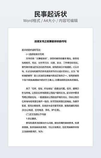 本作品内容为民事起诉状(钢材买卖合同)下载,大小为16.68KB,作品为高清大图模板,格式为docx, 属于民事起诉模板,作品模板源文件下载后可用编辑替换,模板中如有人物画像仅供参考禁止商用。小Q办公网-提供简历,PPT,Word,Excel优质模板素材下载模版平台,拥有海量的工作总结、竞聘求职、年终颁奖、计划书等。 通过小Q办公网下载民事起诉模板源文件编辑修改源文件文字和图片即可使用。