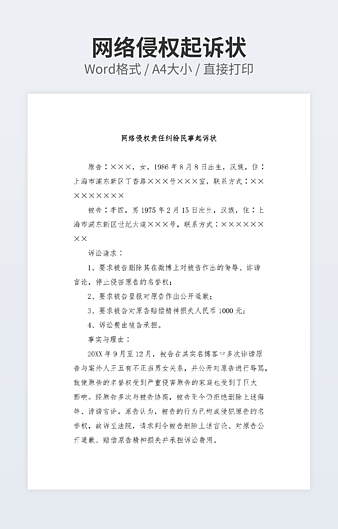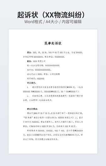 本作品内容为法律文书之民事起诉状的书写下载,大小为15.26KB,作品为高清大图模板,格式为docx, 属于民事起诉模板,作品模板源文件下载后可用编辑替换,模板中如有人物画像仅供参考禁止商用。小Q办公网-提供简历,PPT,Word,Excel优质模板素材下载模版平台,拥有海量的工作总结、竞聘求职、年终颁奖、计划书等。 通过小Q办公网下载民事起诉模板源文件编辑修改源文件文字和图片即可使用。