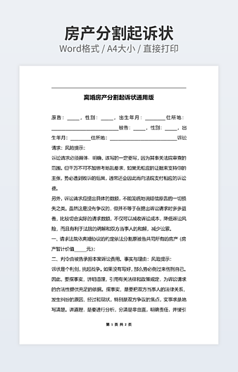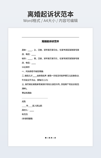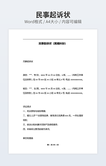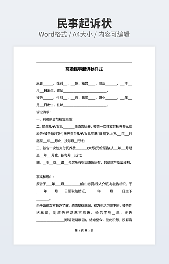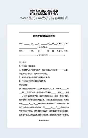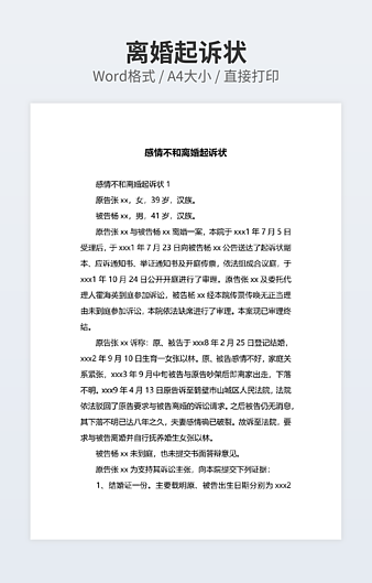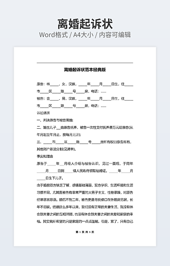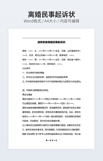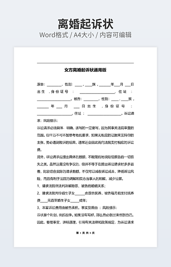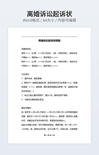 【特殊限制】设计师仅对作品中独创性部分享有著作权,对作品中含有的国旗、国徽等政治图案不享有权利,仅作为作品整体效果的示例展示,禁止商用。 相关关键词: 离婚 起诉书 模板 范本