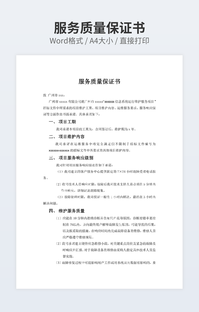 本作品内容为单元门工程质量保证书下载,大小为18.63KB,作品为高清大图模板,格式为docx, 属于保证书模板,作品模板源文件下载后可用编辑替换,模板中如有人物画像仅供参考禁止商用。小Q办公网-提供简历,PPT,Word,Excel优质模板素材下载模版平台,拥有海量的工作总结、竞聘求职、年终颁奖、计划书等。 通过小Q办公网下载保证书模板源文件编辑修改源文件文字和图片即可使用。