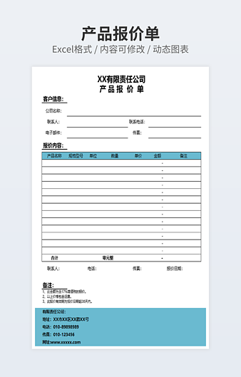 本作品内容为产 品 报 价 单 下载,大小为12.17KB,作品为高清大图模板,格式为xlsx, 属于报价单模板,作品模板源文件下载后可用编辑替换,模板中如有人物画像仅供参考禁止商用。小Q办公网-提供简历,PPT,Word,Excel优质模板素材下载模版平台,拥有海量的工作总结、竞聘求职、年终颁奖、计划书等。 通过小Q办公网下载报价单模板源文件编辑修改源文件文字和图片即可使用。