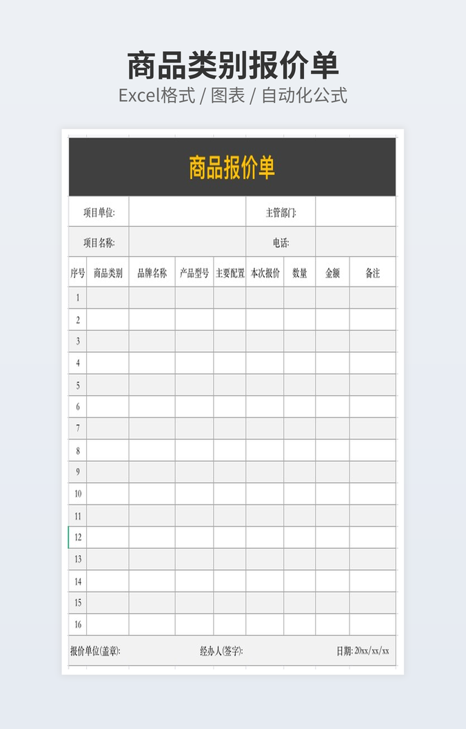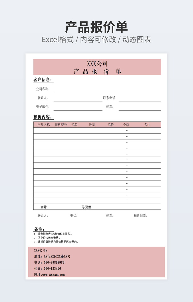 本作品内容为公司报价单 (2)下载,大小为29.5KB,作品为高清大图模板,格式为xlsx, 属于报价单模板,作品模板源文件下载后可用编辑替换,模板中如有人物画像仅供参考禁止商用。小Q办公网-提供简历,PPT,Word,Excel优质模板素材下载模版平台,拥有海量的工作总结、竞聘求职、年终颁奖、计划书等。 通过小Q办公网下载报价单模板源文件编辑修改源文件文字和图片即可使用。