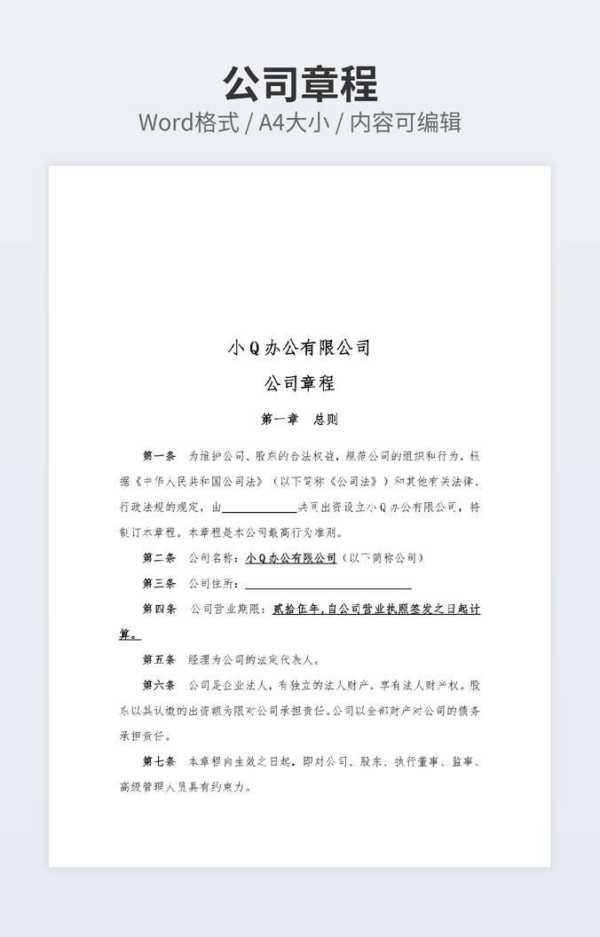 【特殊限制】设计师仅对作品中独创性部分享有著作权,对作品中含有的国旗、国徽等政治图案不享有权利,仅作为作品整体效果的示例展示,禁止商用。 相关关键词: 公司 章程