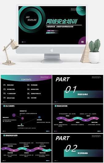 【特殊限制】设计师仅对作品中独创性部分享有著作权,对作品中含有的国旗、国徽等政治图案不享有权利,仅作为作品整体效果的示例展示,禁止商用。 相关关键词: 紫色 扁平 网络安全 宣传 PPT 模板