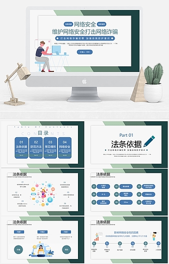 【特殊限制】设计师仅对作品中独创性部分享有著作权,对作品中含有的国旗、国徽等政治图案不享有权利,仅作为作品整体效果的示例展示,禁止商用。 相关关键词: 青色 扁平 网络安全 宣传 PPT 模板
