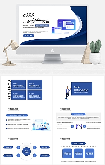 【特殊限制】设计师仅对作品中独创性部分享有著作权,对作品中含有的国旗、国徽等政治图案不享有权利,仅作为作品整体效果的示例展示,禁止商用。 相关关键词: 青蓝 蓝色 扁平 网络安全 宣传 PPT 模板