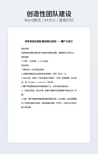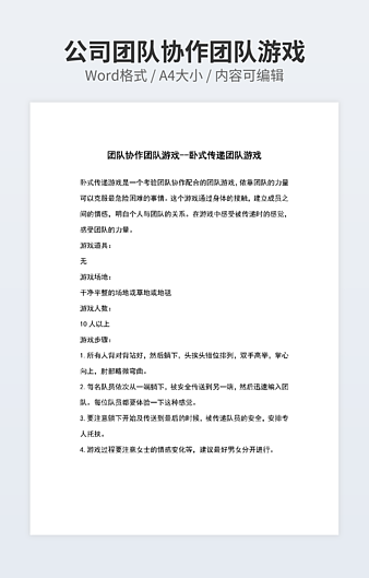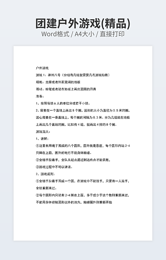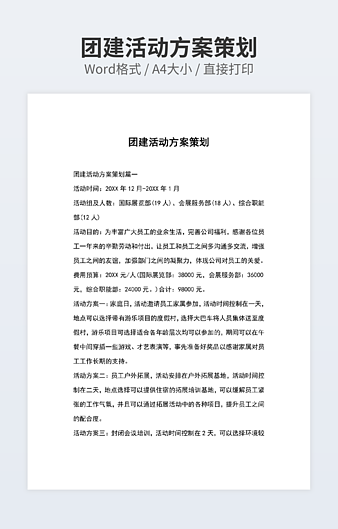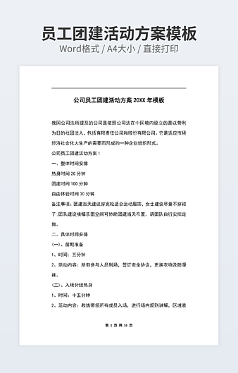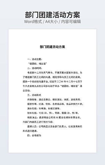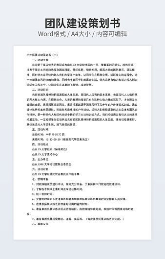 本作品内容为员工团建活动方案下载,大小为25.44KB,作品为高清大图模板,格式为docx, 属于团队建设模板,作品模板源文件下载后可用编辑替换,模板中如有人物画像仅供参考禁止商用。小Q办公网-提供简历,PPT,Word,Excel优质模板素材下载模版平台,拥有海量的工作总结、竞聘求职、年终颁奖、计划书等。 通过小Q办公网下载团队建设模板源文件编辑修改源文件文字和图片即可使用。