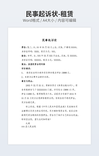【特殊限制】设计师仅对作品中独创性部分享有著作权,对作品中含有的国旗、国徽等政治图案不享有权利,仅作为作品整体效果的示例展示,禁止商用。 相关关键词: 起诉状 合同 货款