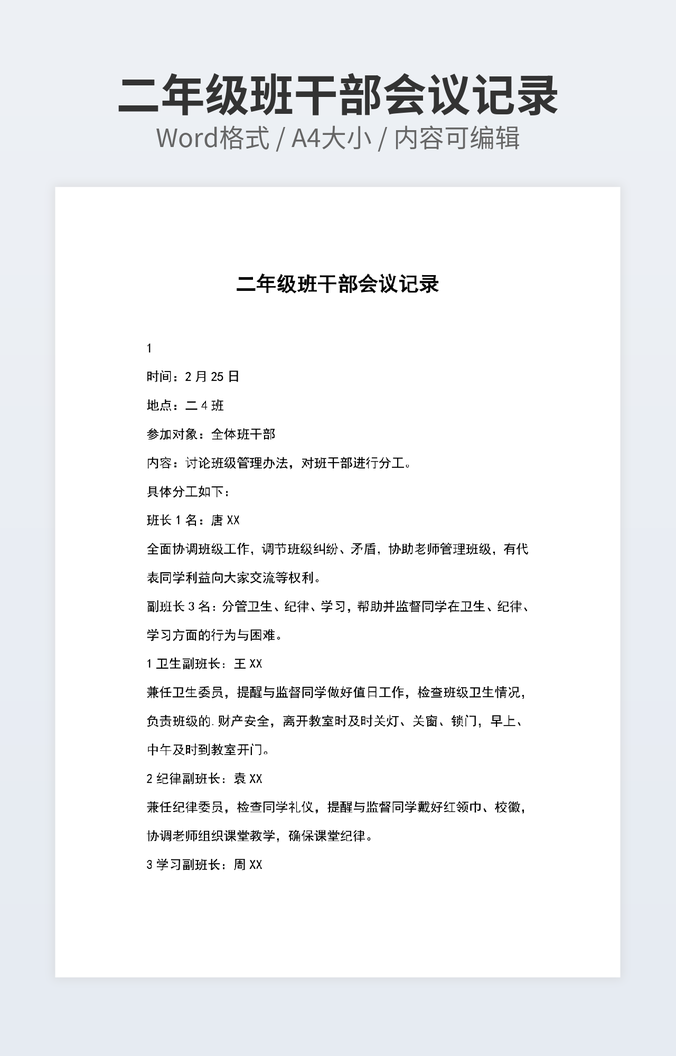 本作品内容为个人会议记录下载,大小为2.21MB,作品为高清大图模板,格式为docx, 属于会议记录模板,作品模板源文件下载后可用编辑替换,模板中如有人物画像仅供参考禁止商用。小Q办公网-提供简历,PPT,Word,Excel优质模板素材下载模版平台,拥有海量的工作总结、竞聘求职、年终颁奖、计划书等。 通过小Q办公网下载会议记录模板源文件编辑修改源文件文字和图片即可使用。