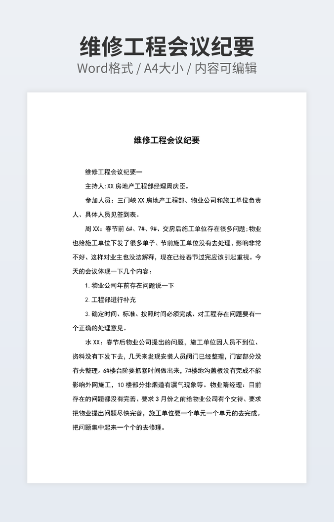 本作品内容为会议纪要表下载,大小为2.08MB,作品为高清大图模板,格式为docx, 属于会议记录模板,作品模板源文件下载后可用编辑替换,模板中如有人物画像仅供参考禁止商用。小Q办公网-提供简历,PPT,Word,Excel优质模板素材下载模版平台,拥有海量的工作总结、竞聘求职、年终颁奖、计划书等。 通过小Q办公网下载会议记录模板源文件编辑修改源文件文字和图片即可使用。