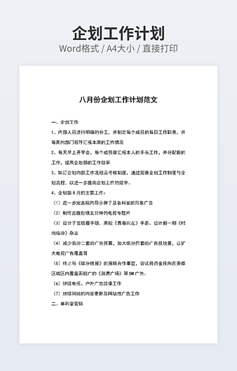 本作品内容为销售人员工作计划书下载,大小为20.39KB,作品为高清大图模板,格式为docx, 属于工作计划模板,作品模板源文件下载后可用编辑替换,模板中如有人物画像仅供参考禁止商用。小Q办公网-提供简历,PPT,Word,Excel优质模板素材下载模版平台,拥有海量的工作总结、竞聘求职、年终颁奖、计划书等。 通过小Q办公网下载工作计划模板源文件编辑修改源文件文字和图片即可使用。