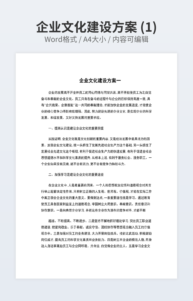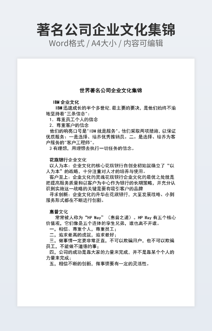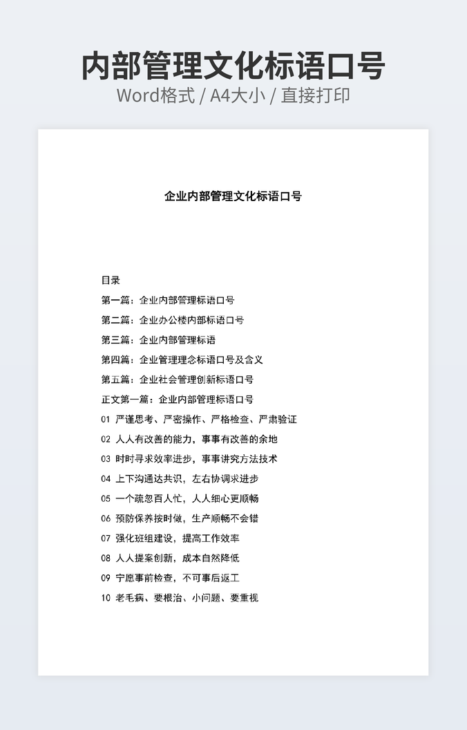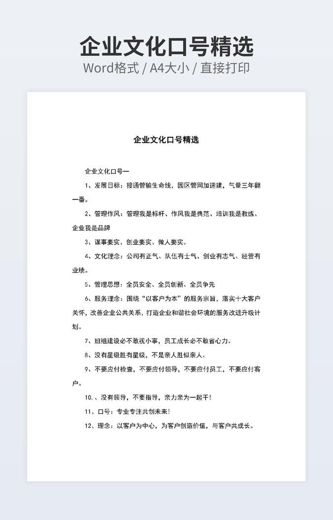 本作品内容为公司文化墙企业文化口号下载,大小为16.25KB,作品为高清大图模板,格式为docx, 属于企业文化模板,作品模板源文件下载后可用编辑替换,模板中如有人物画像仅供参考禁止商用。小Q办公网-提供简历,PPT,Word,Excel优质模板素材下载模版平台,拥有海量的工作总结、竞聘求职、年终颁奖、计划书等。 通过小Q办公网下载企业文化模板源文件编辑修改源文件文字和图片即可使用。