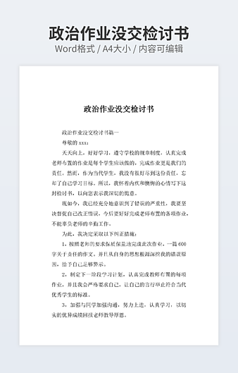 本作品内容为抄作业的检讨书下载,大小为21.72KB,作品为高清大图模板,格式为docx, 属于检讨书模板,作品模板源文件下载后可用编辑替换,模板中如有人物画像仅供参考禁止商用。小Q办公网-提供简历,PPT,Word,Excel优质模板素材下载模版平台,拥有海量的工作总结、竞聘求职、年终颁奖、计划书等。 通过小Q办公网下载检讨书模板源文件编辑修改源文件文字和图片即可使用。