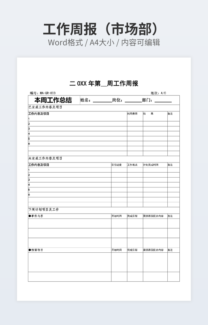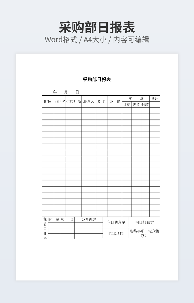 本作品内容为包装组日报表下载,大小为41KB,作品为高清大图模板,格式为doc, 属于日报/周报/月报模板,作品模板源文件下载后可用编辑替换,模板中如有人物画像仅供参考禁止商用。小Q办公网-提供简历,PPT,Word,Excel优质模板素材下载模版平台,拥有海量的工作总结、竞聘求职、年终颁奖、计划书等。 通过小Q办公网下载日报/周报/月报模板源文件编辑修改源文件文字和图片即可使用。