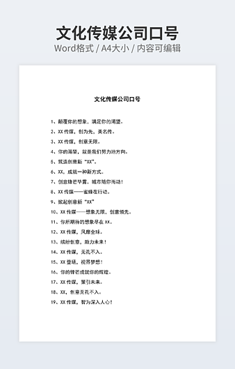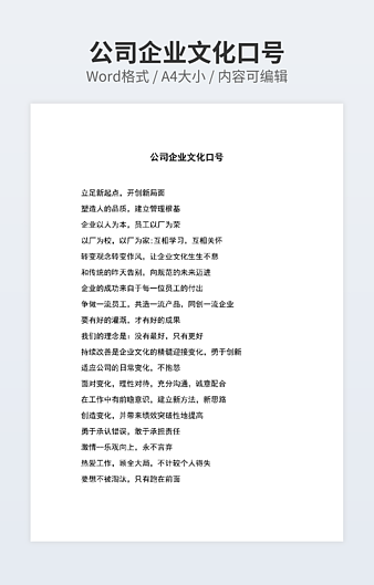 本作品内容为物流企业文化口号下载,大小为17.44KB,作品为高清大图模板,格式为docx, 属于企业文化模板,作品模板源文件下载后可用编辑替换,模板中如有人物画像仅供参考禁止商用。小Q办公网-提供简历,PPT,Word,Excel优质模板素材下载模版平台,拥有海量的工作总结、竞聘求职、年终颁奖、计划书等。 通过小Q办公网下载企业文化模板源文件编辑修改源文件文字和图片即可使用。
