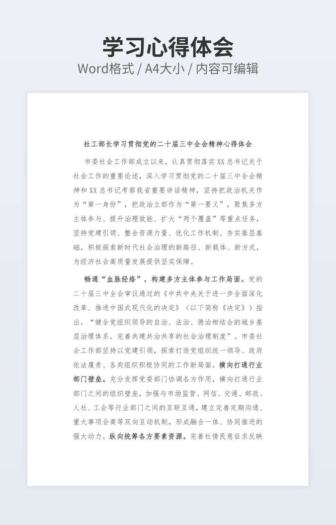 【特殊限制】设计师仅对作品中独创性部分享有著作权,对作品中含有的国旗、国徽等政治图案不享有权利,仅作为作品整体效果的示例展示,禁止商用。 相关关键词: 国企 党员 干部 关于 党的 二十 十届 三中全会 学习 心得体会