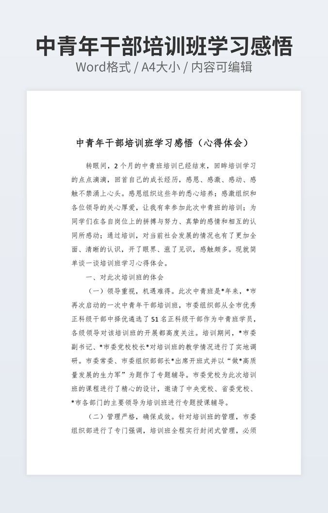本作品内容为春季中青年干部培训班心得体会下载,大小为13.06KB,作品为高清大图模板,格式为docx, 属于心得体会模板,作品模板源文件下载后可用编辑替换,模板中如有人物画像仅供参考禁止商用。小Q办公网-提供简历,PPT,Word,Excel优质模板素材下载模版平台,拥有海量的工作总结、竞聘求职、年终颁奖、计划书等。 通过小Q办公网下载心得体会模板源文件编辑修改源文件文字和图片即可使用。
