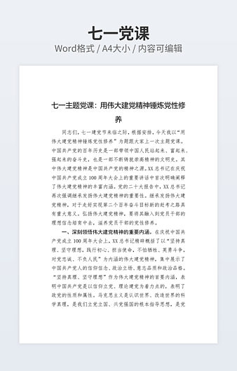 本作品内容为七一党课讲稿提纲下载,大小为14.7KB,作品为高清大图模板,格式为docx, 属于党课培训模板,作品模板源文件下载后可用编辑替换,模板中如有人物画像仅供参考禁止商用。小Q办公网-提供简历,PPT,Word,Excel优质模板素材下载模版平台,拥有海量的工作总结、竞聘求职、年终颁奖、计划书等。 通过小Q办公网下载党课培训模板源文件编辑修改源文件文字和图片即可使用。