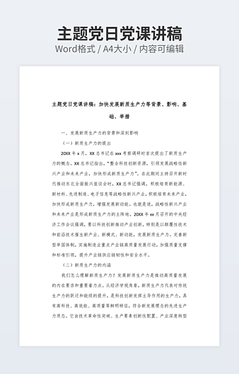 本作品内容为党课:以党的创新理论引领国企高质量发展下载,大小为18.64KB,作品为高清大图模板,格式为docx, 属于党课培训模板,作品模板源文件下载后可用编辑替换,模板中如有人物画像仅供参考禁止商用。小Q办公网-提供简历,PPT,Word,Excel优质模板素材下载模版平台,拥有海量的工作总结、竞聘求职、年终颁奖、计划书等。 通过小Q办公网下载党课培训模板源文件编辑修改源文件文字和图片即可使用。