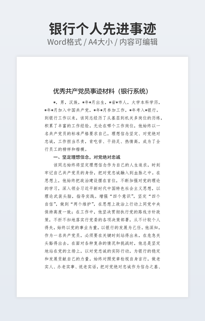 【特殊限制】设计师仅对作品中独创性部分享有著作权,对作品中含有的国旗、国徽等政治图案不享有权利,仅作为作品整体效果的示例展示,禁止商用。 相关关键词: 优秀党员 先进事迹 教师