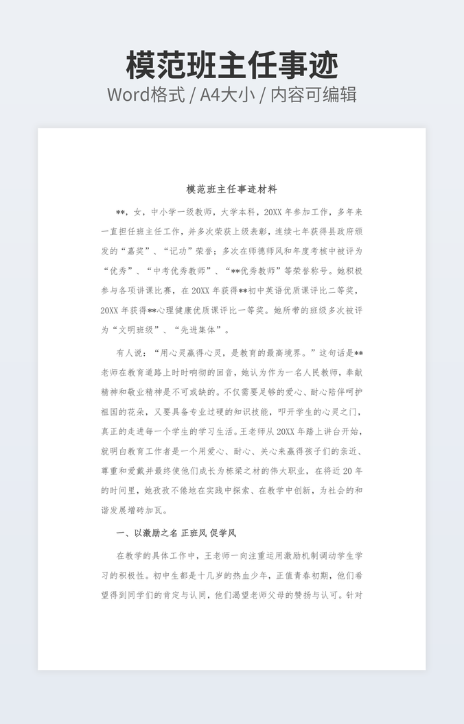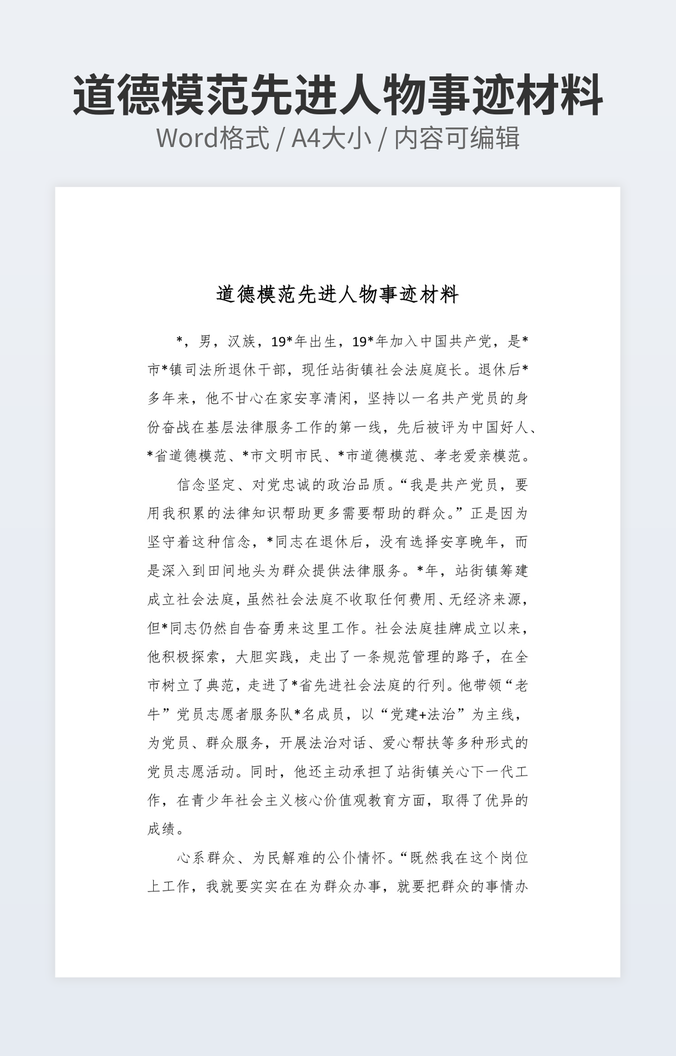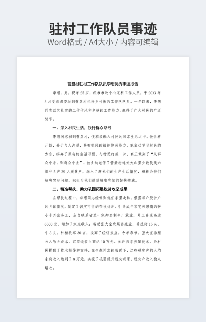 本作品内容为招商引资先进个人事迹下载,大小为12.56KB,作品为高清大图模板,格式为docx, 属于先进事迹模板,作品模板源文件下载后可用编辑替换,模板中如有人物画像仅供参考禁止商用。小Q办公网-提供简历,PPT,Word,Excel优质模板素材下载模版平台,拥有海量的工作总结、竞聘求职、年终颁奖、计划书等。 通过小Q办公网下载先进事迹模板源文件编辑修改源文件文字和图片即可使用。