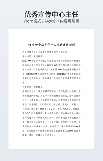 本作品内容为拥军优属个人事迹下载,大小为13.08KB,作品为高清大图模板,格式为docx, 属于先进事迹模板,作品模板源文件下载后可用编辑替换,模板中如有人物画像仅供参考禁止商用。小Q办公网-提供简历,PPT,Word,Excel优质模板素材下载模版平台,拥有海量的工作总结、竞聘求职、年终颁奖、计划书等。 通过小Q办公网下载先进事迹模板源文件编辑修改源文件文字和图片即可使用。