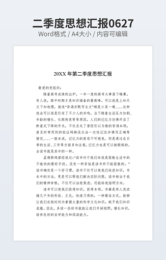 本作品内容为二季度思想汇报0612下载,大小为21.54KB,作品为高清大图模板,格式为docx, 属于思想汇报模板,作品模板源文件下载后可用编辑替换,模板中如有人物画像仅供参考禁止商用。小Q办公网-提供简历,PPT,Word,Excel优质模板素材下载模版平台,拥有海量的工作总结、竞聘求职、年终颁奖、计划书等。 通过小Q办公网下载思想汇报模板源文件编辑修改源文件文字和图片即可使用。