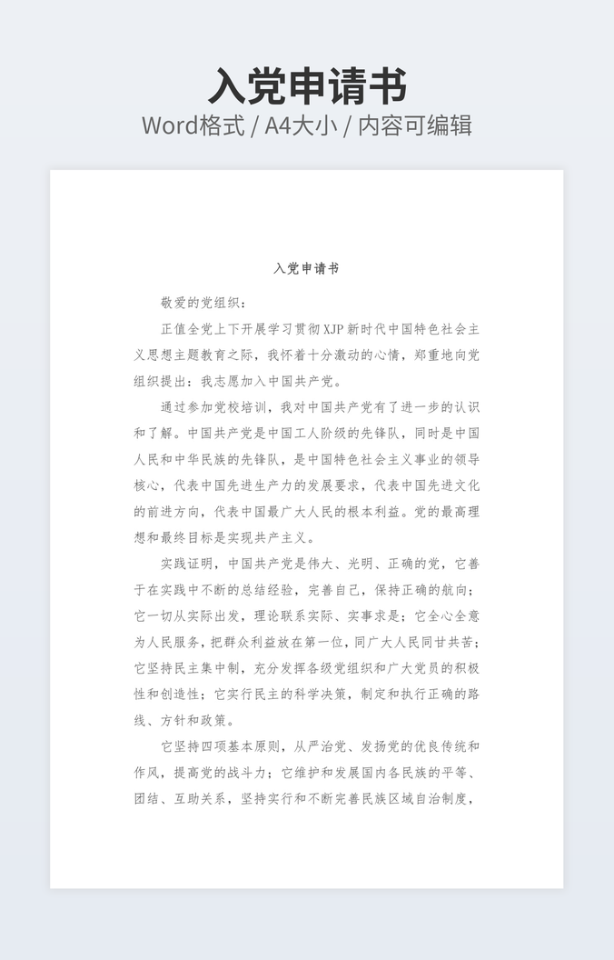 【特殊限制】设计师仅对作品中独创性部分享有著作权,对作品中含有的国旗、国徽等政治图案不享有权利,仅作为作品整体效果的示例展示,禁止商用。 相关关键词: 高校 大学生 入党 入党申请 申请书